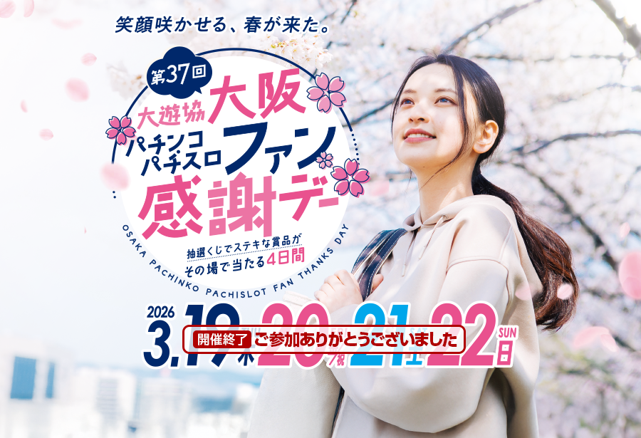 大阪府遊技業協同組合(大遊協)は2026年3月19日(木)~22日(日)の4日間、パチンコ・パチスロファンの皆様へ日頃の感謝の気...