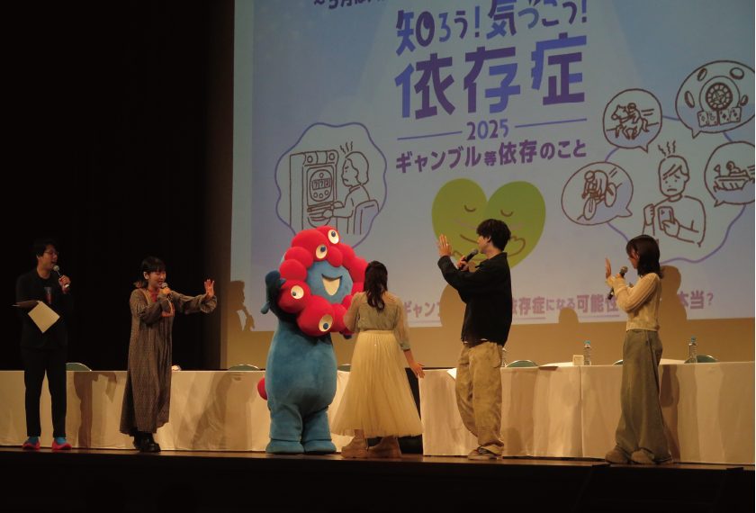 冒頭、大阪府の西野誠健康医療部長が主催者あいさつに立ち、「今回のシンポジウムを通じて、依存対策の一助となれば」と開催意義を説明。第1部では、トークショーとして3名の声優が登壇。声優の梶原岳人さん、鈴木絵理さん、田澤茉純さんと司会進行のタケモトコウジさん(ラジオ関西パーソナリティ)、近藤夏子さん(シンガーソングライター・ラジオ関西パーソナリティ)が、熱中すること・熱中し過ぎることの認識や日常ののめり込み、依存について考えを深めました。